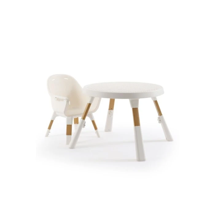 As baby becomes toddler and moves out of the highchair the seat becomes the shorter legged play chair and the play centre turns into a matching table, your child’s very own casual furniture set.Â