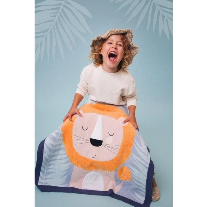 Baby Blanket – Ludvic Lion. This super fun, knitted blanket feature Ludvic lion with his gorgeous boucle mane, sitting in a jungle of leaves. This ever so soft cotton blanket will be a roaring success for any little one !