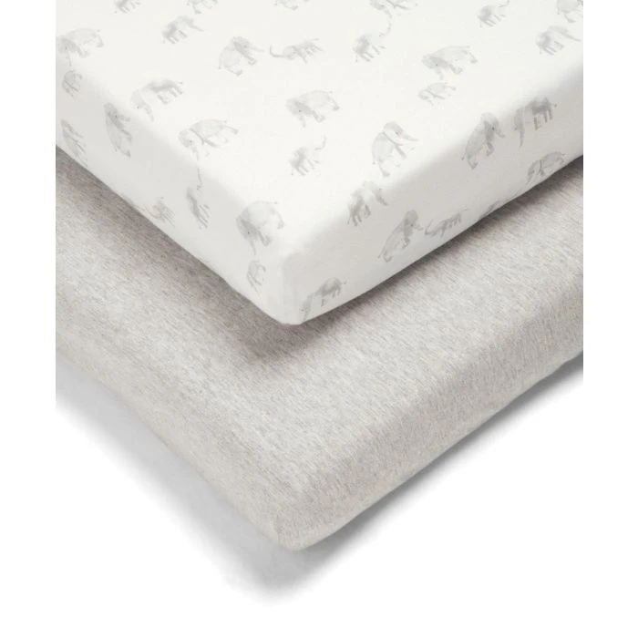 Handy 2-pack of supersoft fitted sheets, designed for our standard size cot bed mattress. Crafted from supersoft jersey cotton that’s gentle on the skin, breathable and comfy, these two printed sheets feature different designs – one features adorable elephant, one in plain grey marl – in co-ordinating neutral grey and white shades that pair perfectly with other pieces in the collection, for a stylishly co-ordinated nursery.