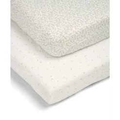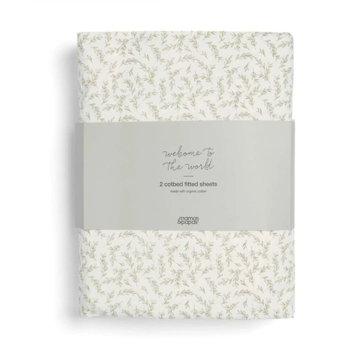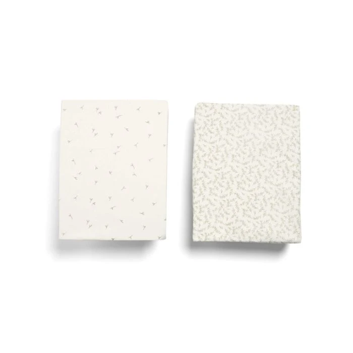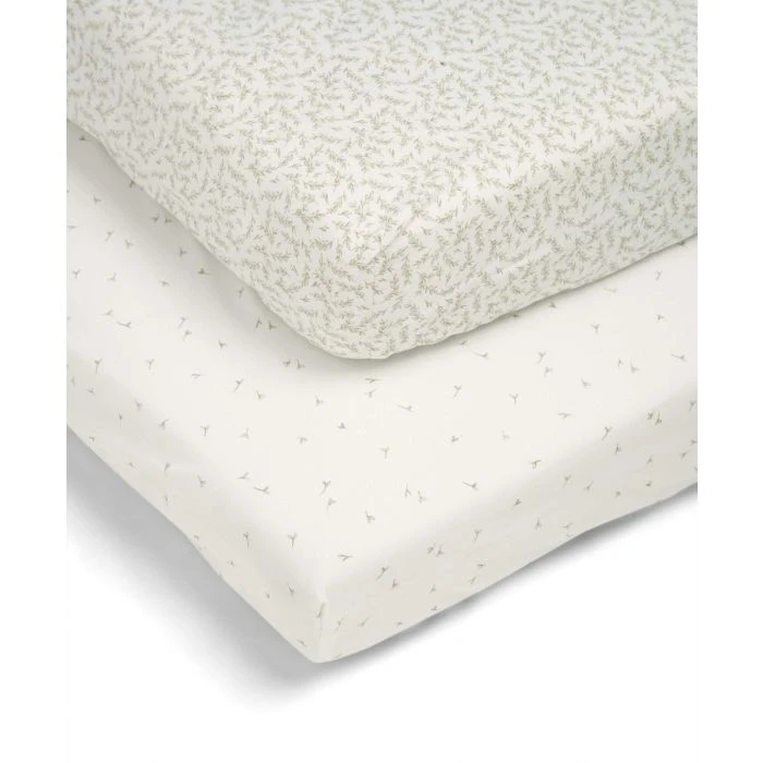 Made with Organic Cotton. A handy set of 2 cotbed fitted sheets. Neutral, unisex and rich in natural tones, both sheets have a warm white base, one features intricate leaf-print in muted sage green, a fine, detailed and elegant print. One is a more simplistic cotton seed print, in neutral mocha shade, a print that’s less busy and works as a beautifully neutral base to other bedding. Rich in earthy tones, prints inspired by nature and soft fabric, this set is an easy way to bring the magic of nature to their nursery.