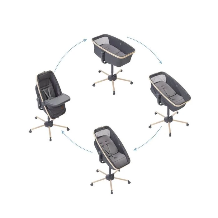 The Maxi Cosi Alba is a unique combination of a bassinet and a highchair, which can be used from birth until 3 years old. Easy one hand action switches from one mode to the other and offers 2 recline positions in between.