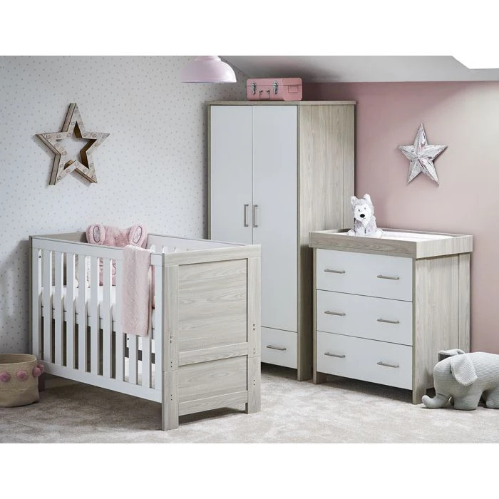 The Obaby Nika range offers a contemporary design, due to its clean lines and textured oak effect finish, that will fit perfectly in today’s modern nursery. This 3 piece room set consists of Nika Mini cot bed, changing unit and double wardrobe.