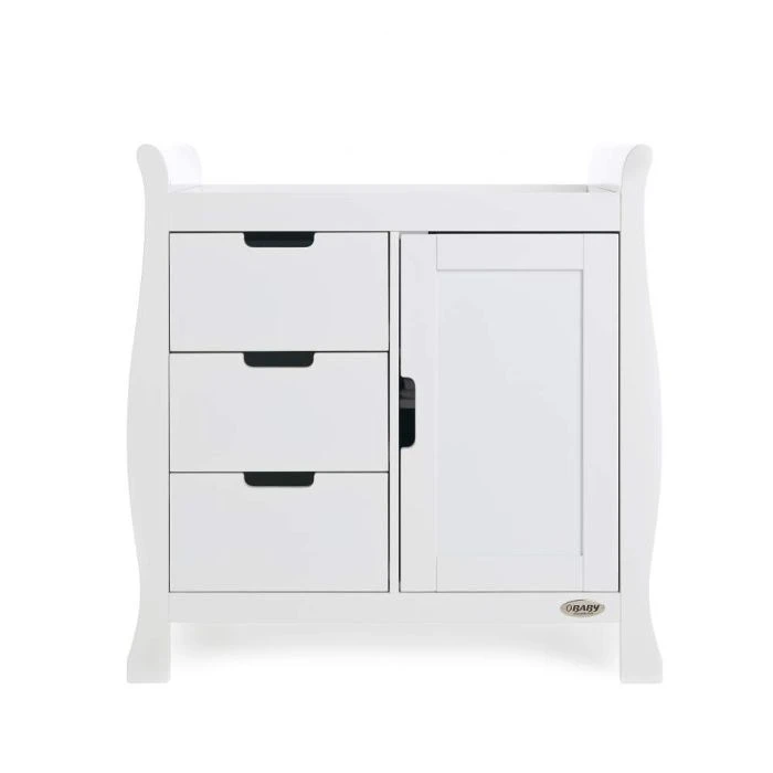 Also part of this beautiful furniture set, the elegant OBaby Stamford Sleigh Closed Changing Unit is crafted using solid wood and uses the same scroll design that flows throughout all of the Stamford range. Sleek lines and recessed handles create a stylish look, whilst ensuring it remains snag free and easy to use. It has a combination of a soft close door, adjustable shelf, three full depth drawers and a full height cupboard that provides plenty of storage options for your baby’s precious belongings. It’s also is cleverly designed to be able to use a changing mat on top.