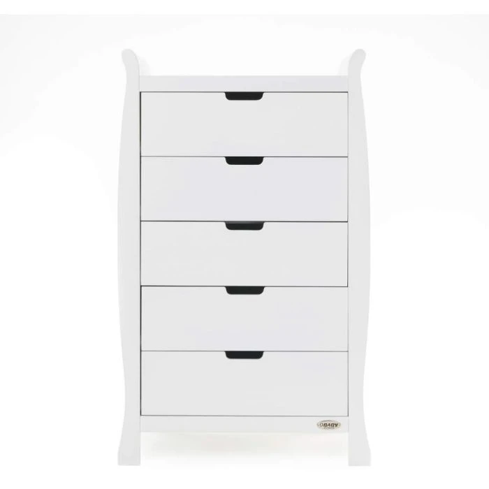 The perfect addition to any nursery, The OBaby Stamford Sleigh Tall Chest of Drawers are ideal for those who need something smaller than a full size wardrobe. It consists of five, deep drawers on smooth gliding runners with recessed handles.