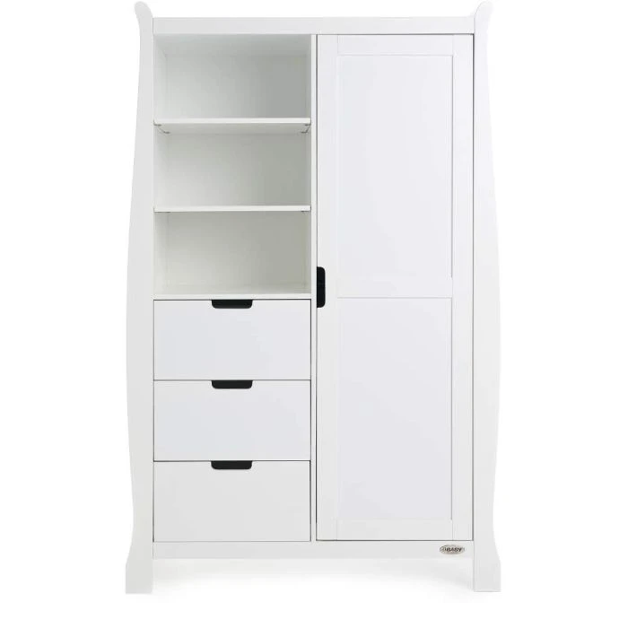 OBaby Stamford Double Wardrobe is designed to last, Manufactured with solid wood. The wardrobe consists of a full height, soft close door that encloses the main cupboard section with two robust hanging rails for storing your little one’s adorable outfits. The left hand side is divided between three adjustable shelves and three full depth drawers ensuring there is always a place to store your child’s belongings.