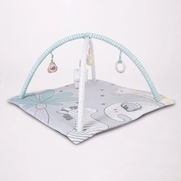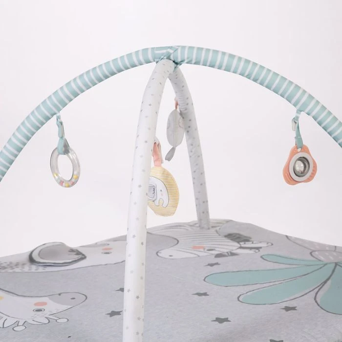 Crinkle fabric hidden activities in the mat coupled with detachable toys on the overhead play arches.