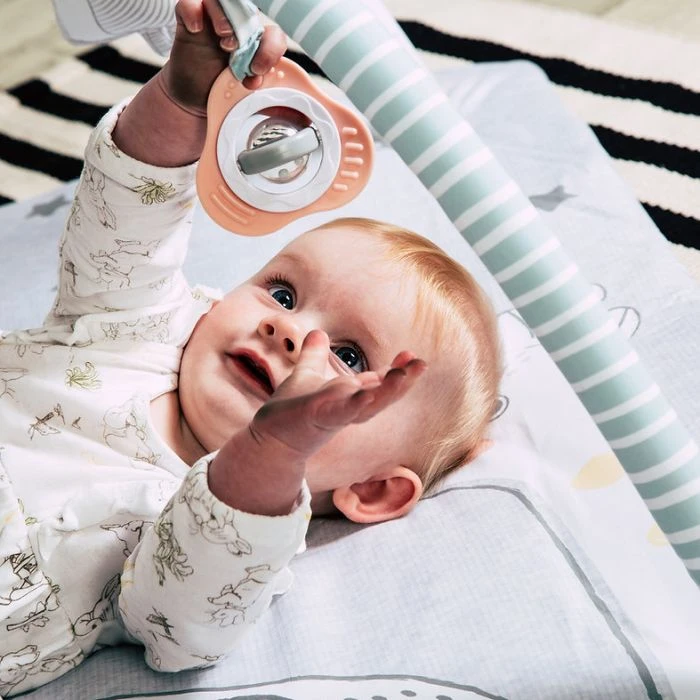 - Detachable play arches with cute character toys and teethers with rattles