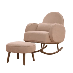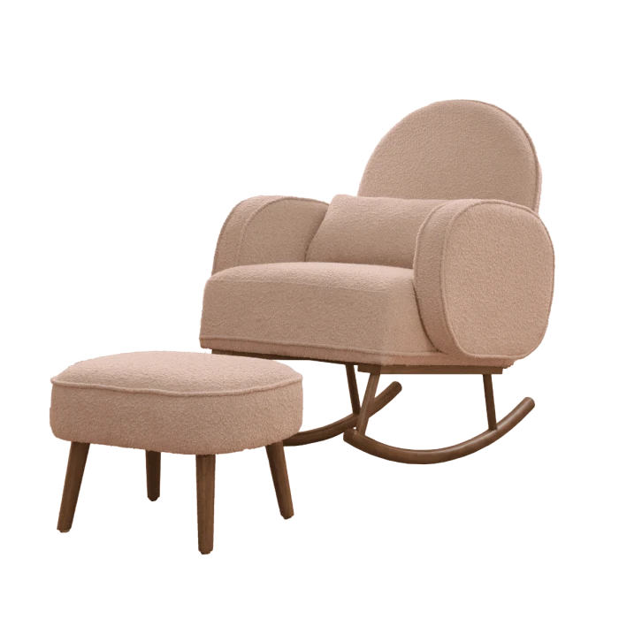 Immerse yourself in unparalleled comfort with the Micah rocking chair. Carefully crafted from soft boucle fabric, its curved edges and ergonomic design promise optimal back and arm support. Take a moment to unwind, relax, and elevate your comfort by propping your feet up on the matching footstool. As your baby grows, transform the Micah into a stylish armchair with its convertible legs, ensuring lasting functionality and chic appeal.