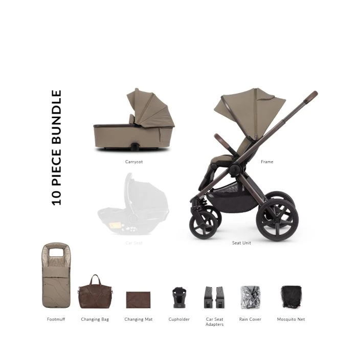 This amazing 10-piece Special Edition bundle includes frame, carrycot, seat unit, eco-leather changing bag, changing mat, shopping bag, footmuff, raincover, mosquito net and car seat adaptors.
